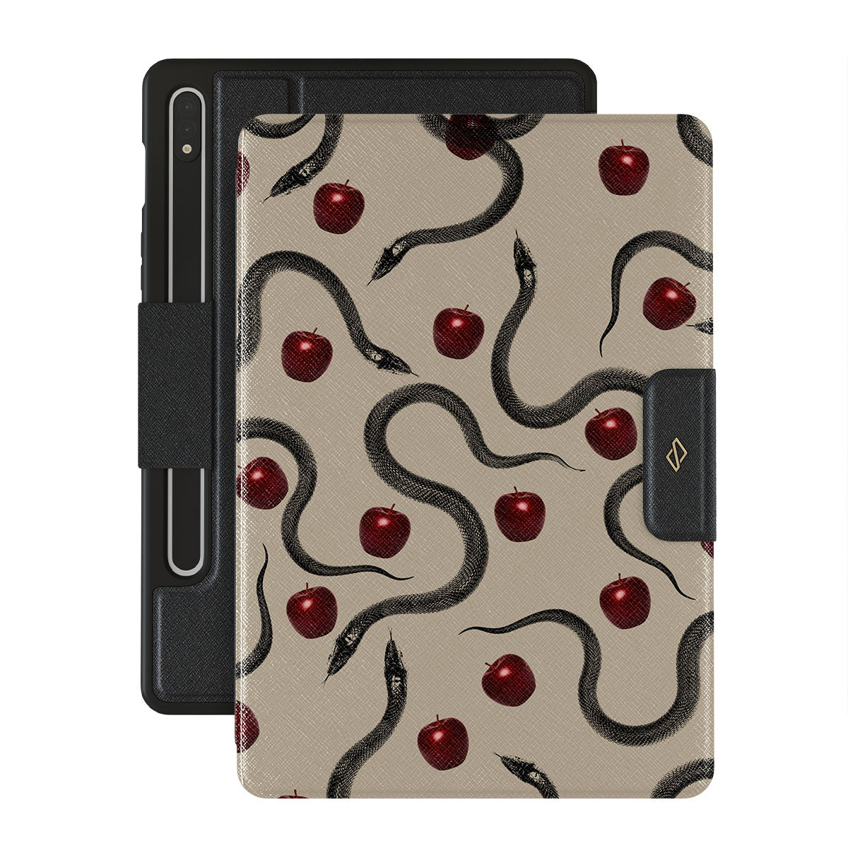 Uwaga: Wzór jest nadrukowany – nie ma faktury ani tłoczenia.Główne elementy projektu: błyszczące czerwone jabłka, zwinięte węże, beżowe odcienie.