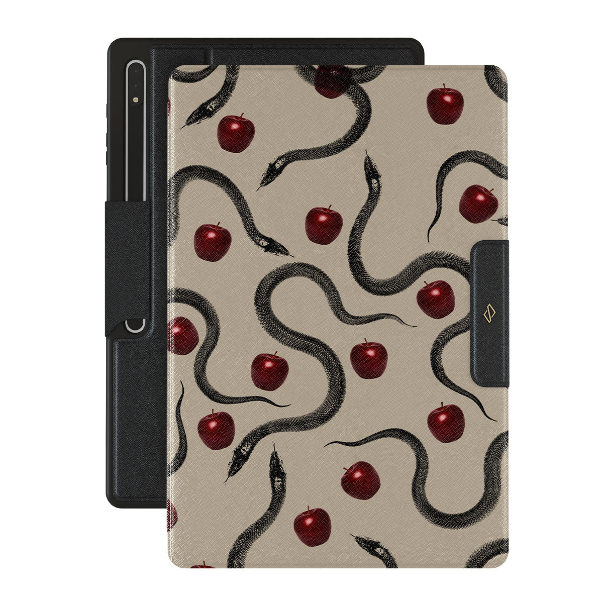 Główne elementy projektu: błyszczące czerwone jabłka, zwinięte węże, beżowe odcienie.