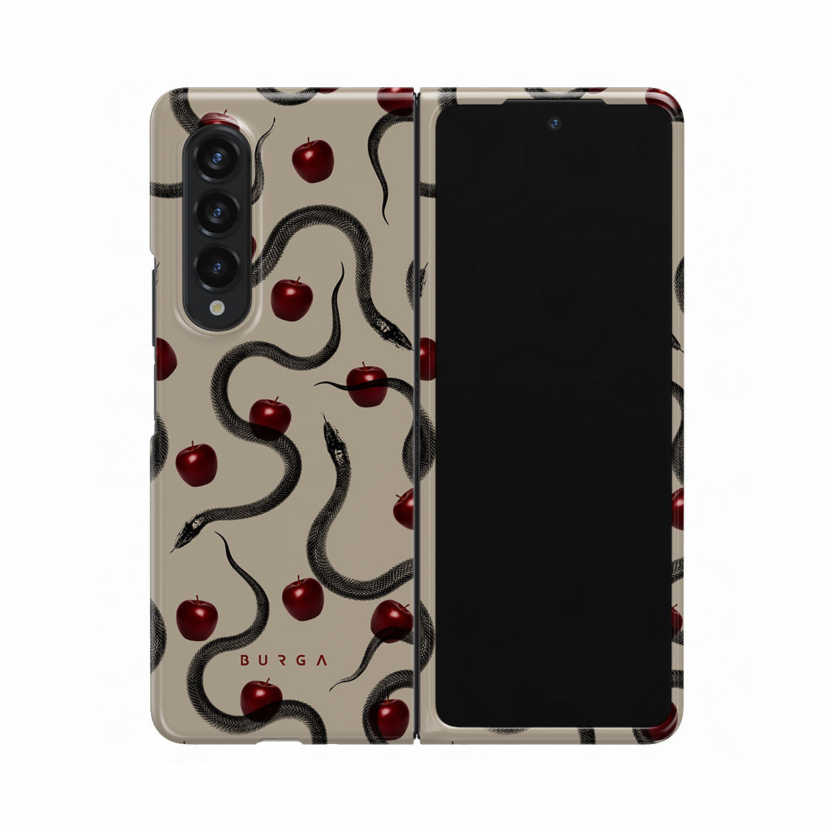 Główne elementy projektu: błyszczące czerwone jabłka, zwinięte węże, beżowe odcienie.
