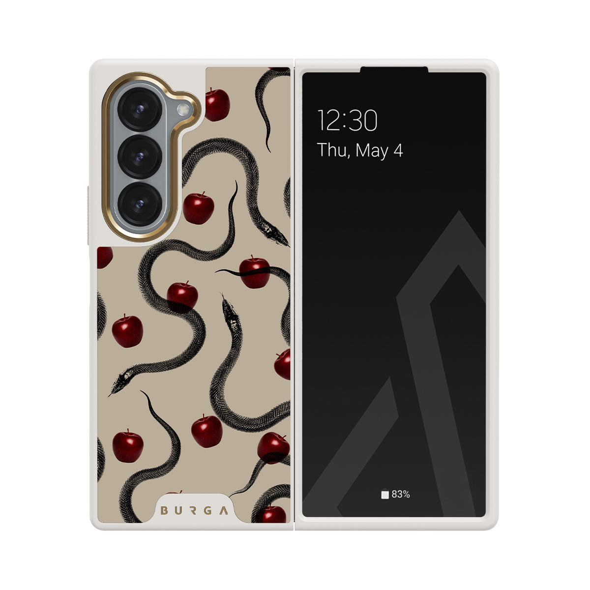 Główne elementy projektu: błyszczące czerwone jabłka, zwinięte węże, beżowe odcienie.