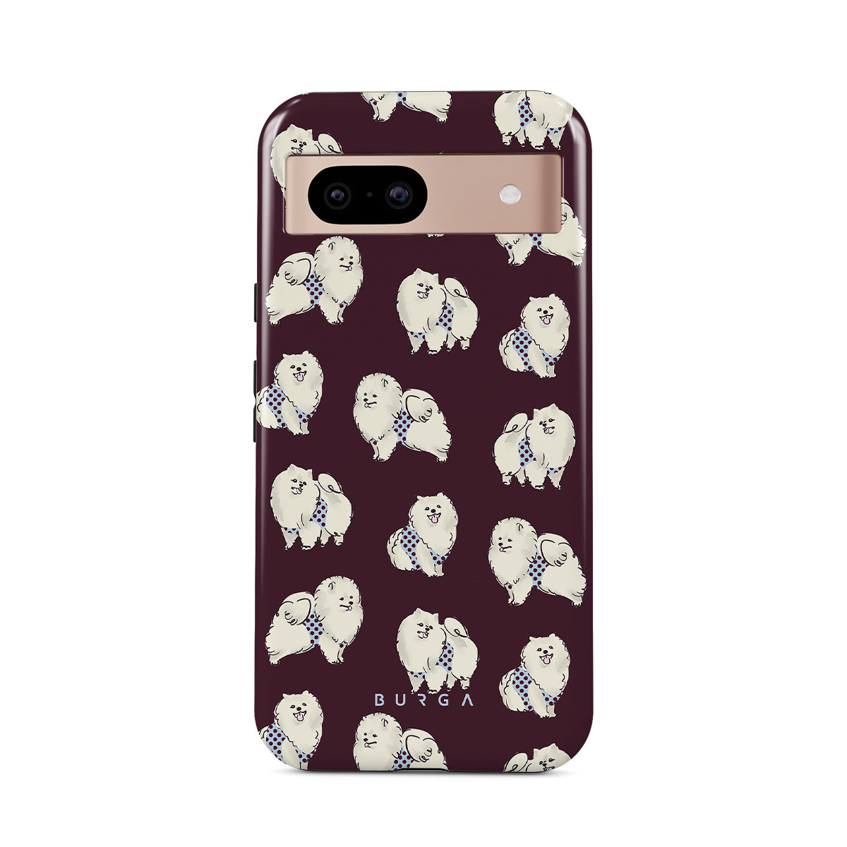Główne elementy projektu: białe, puszyste psy na ciemnym bordowym tle, pudle, zwierzęta domowe.