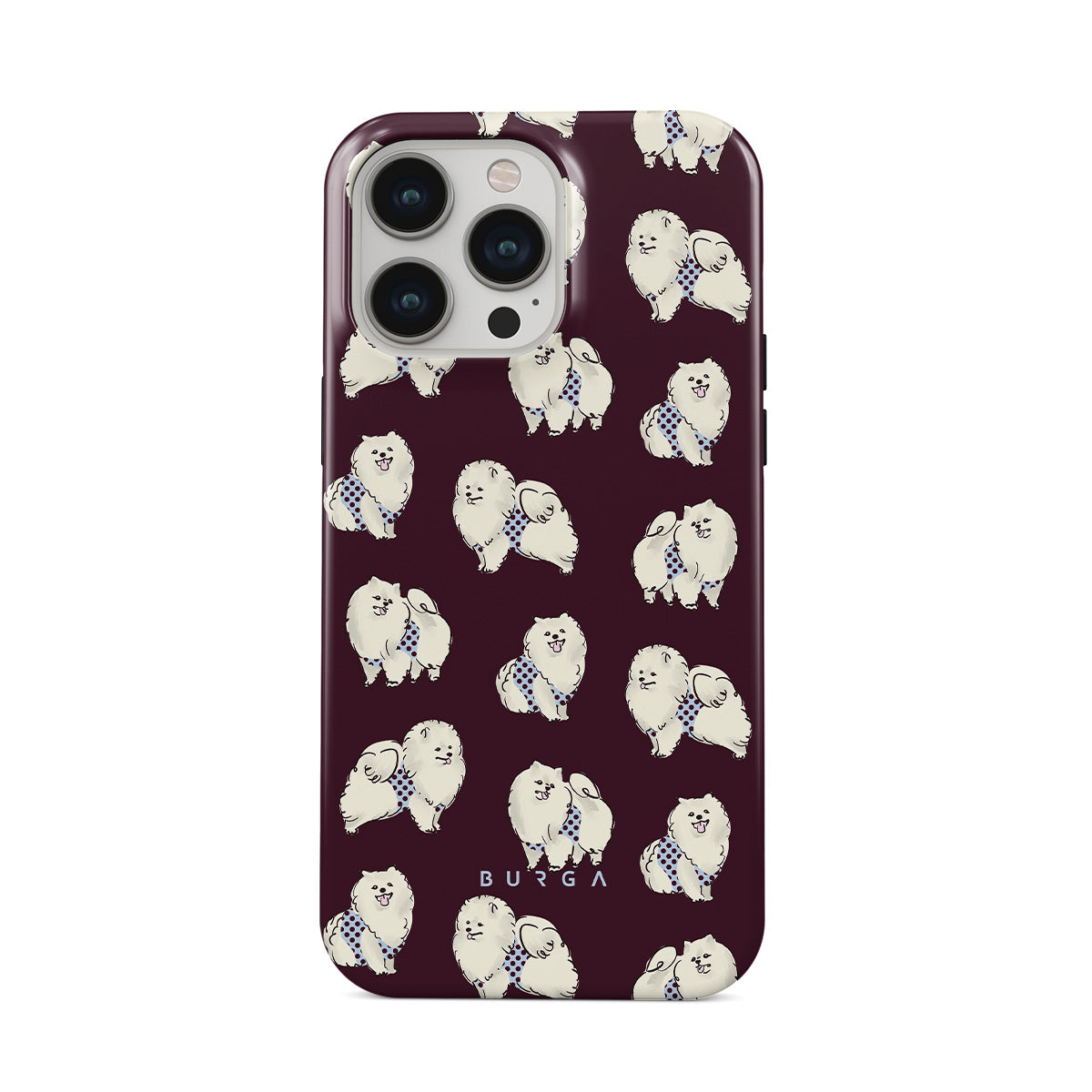 Główne elementy projektu: białe, puszyste psy na ciemnym bordowym tle, pudle, zwierzęta domowe.