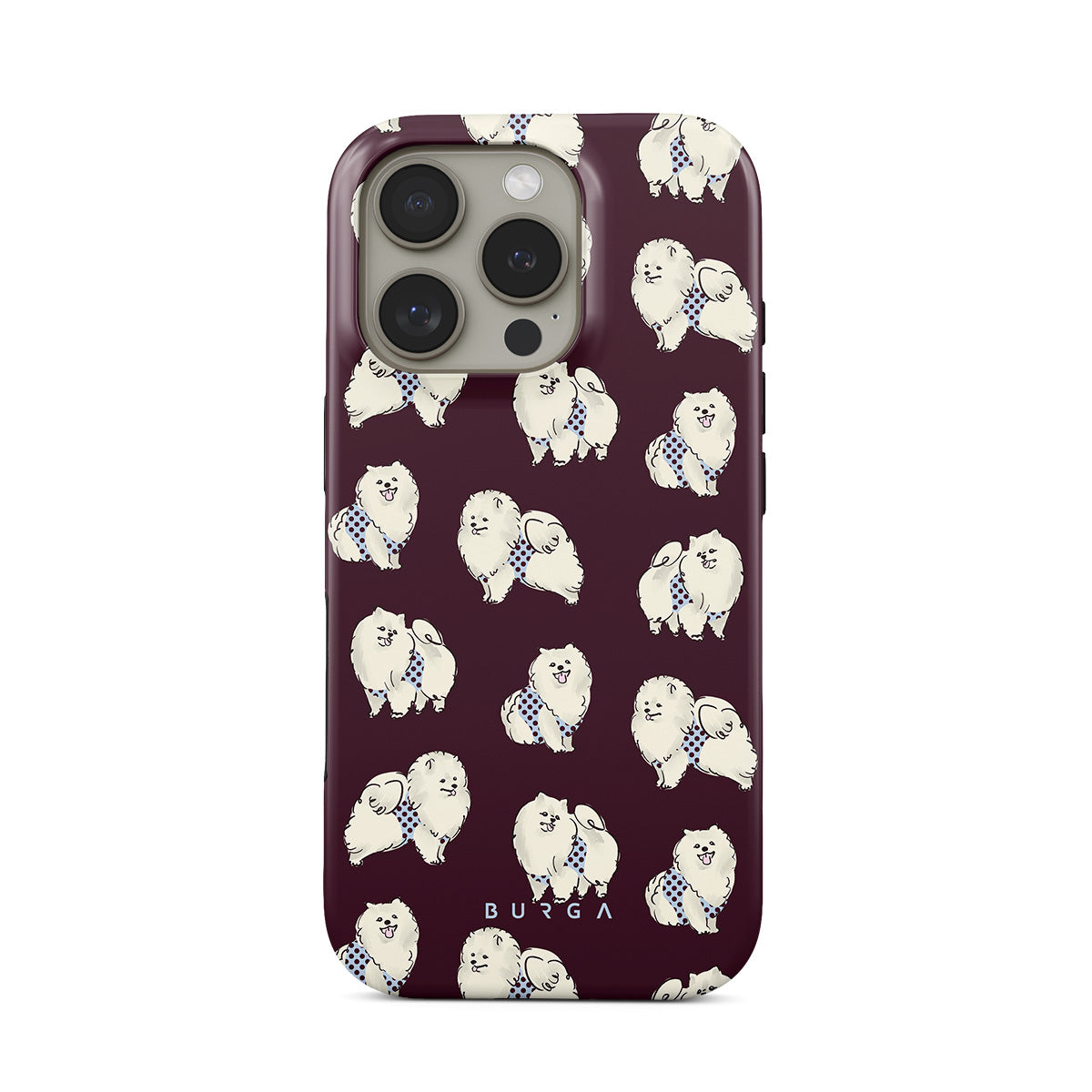 Główne elementy projektu: białe, puszyste psy na ciemnym bordowym tle, pudle, zwierzęta domowe.