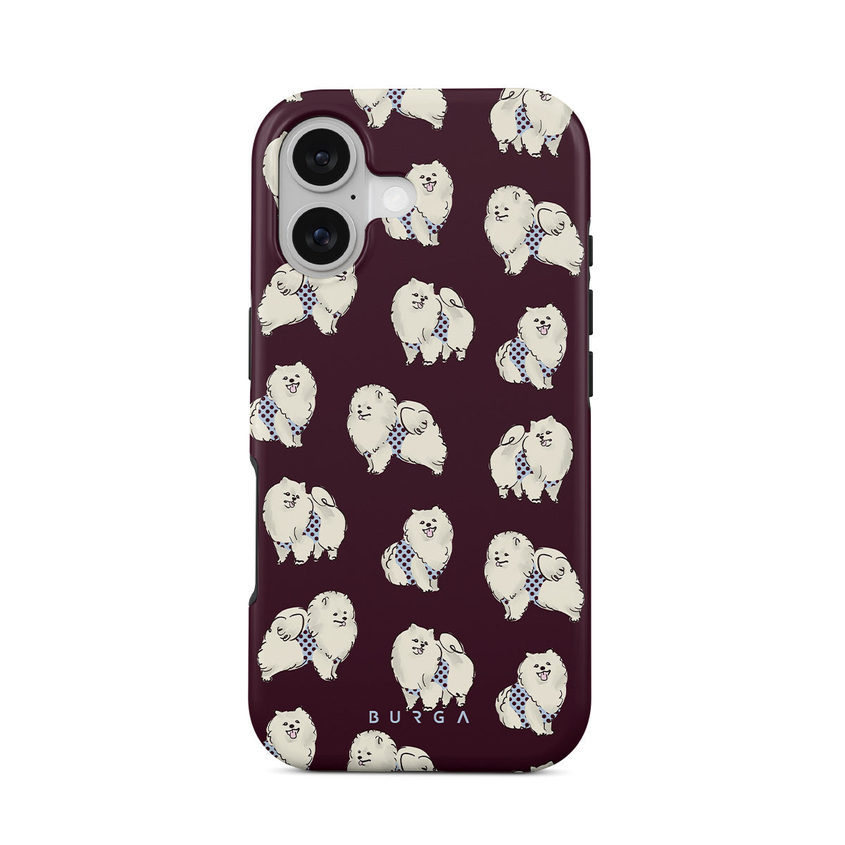 Główne elementy projektu: białe, puszyste psy na ciemnym bordowym tle, pudle, zwierzęta domowe.