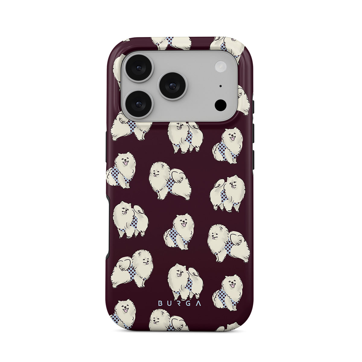 Główne elementy projektu: białe, puszyste psy na ciemnym bordowym tle, pudle, zwierzęta domowe.