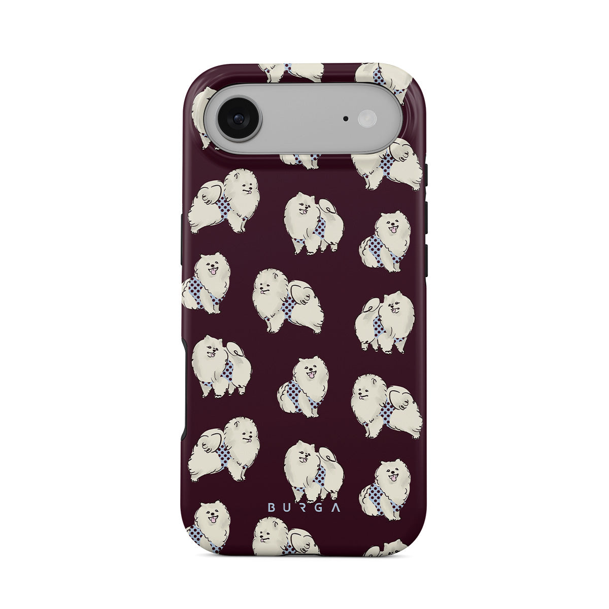 Główne elementy projektu: białe, puszyste psy na ciemnym bordowym tle, pudle, zwierzęta domowe.