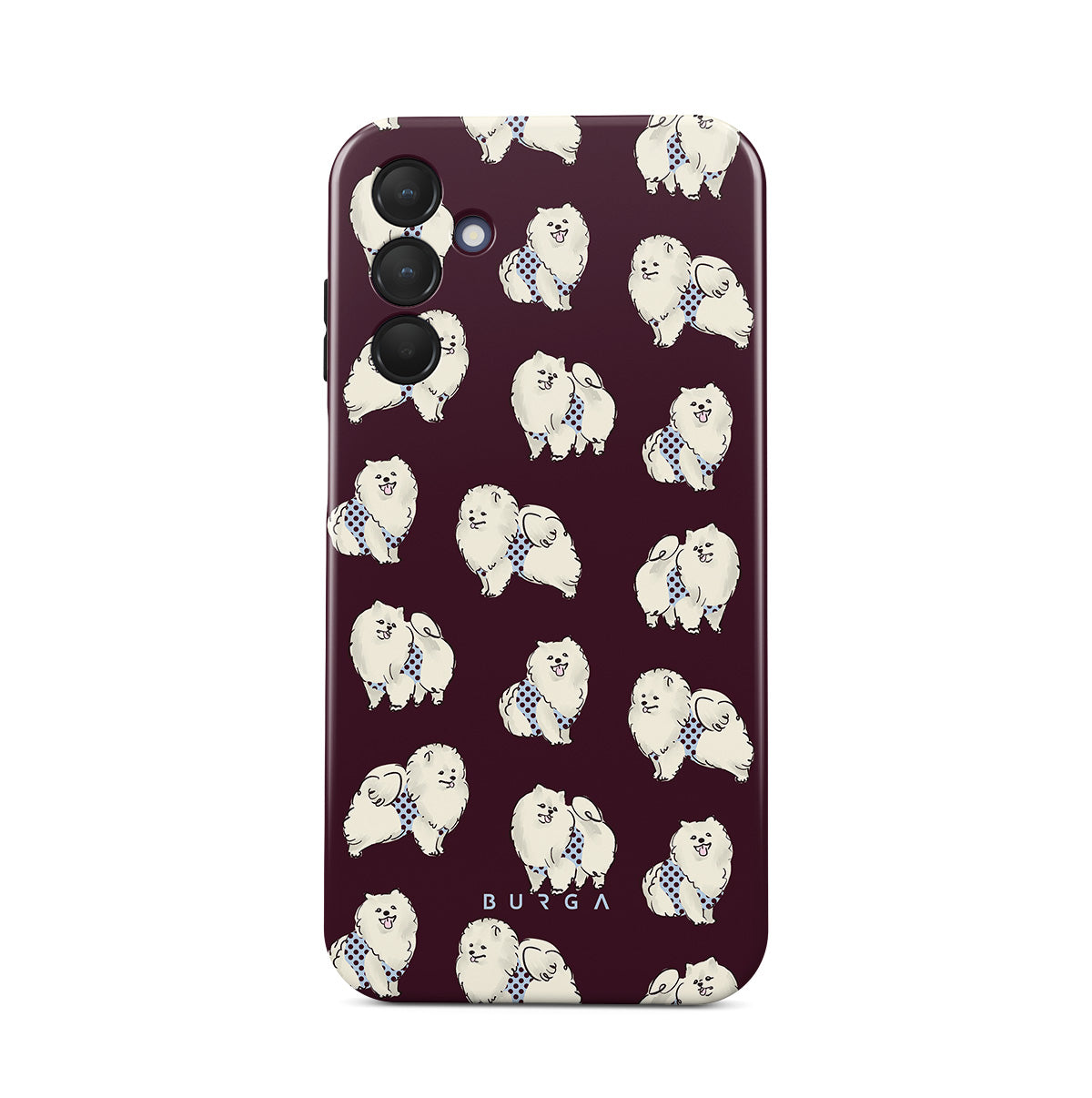 Główne elementy projektu: białe, puszyste psy na ciemnym bordowym tle, pudle, zwierzęta domowe.