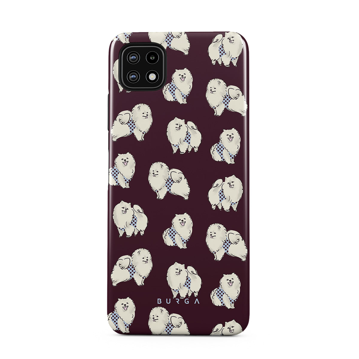 Główne elementy projektu: białe, puszyste psy na ciemnym bordowym tle, pudle, zwierzęta domowe.