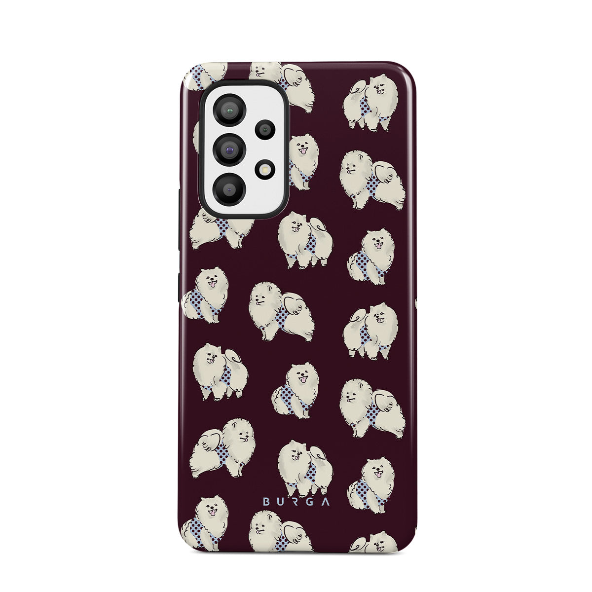 Główne elementy projektu: białe, puszyste psy na ciemnym bordowym tle, pudle, zwierzęta domowe.