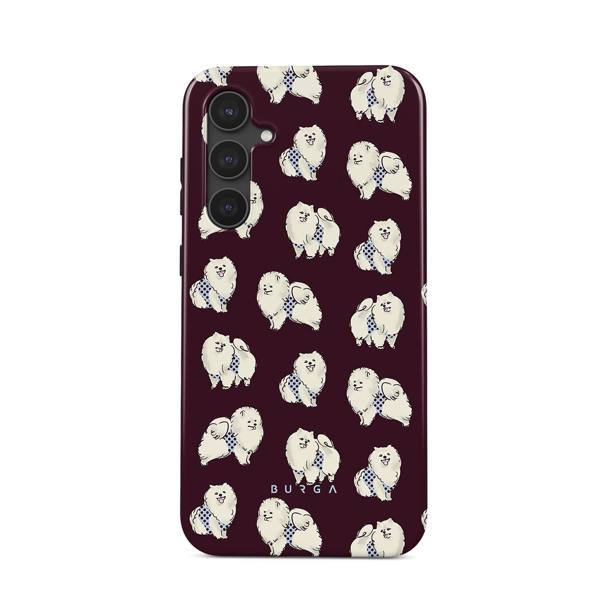Główne elementy projektu: białe, puszyste psy na ciemnym bordowym tle, pudle, zwierzęta domowe.