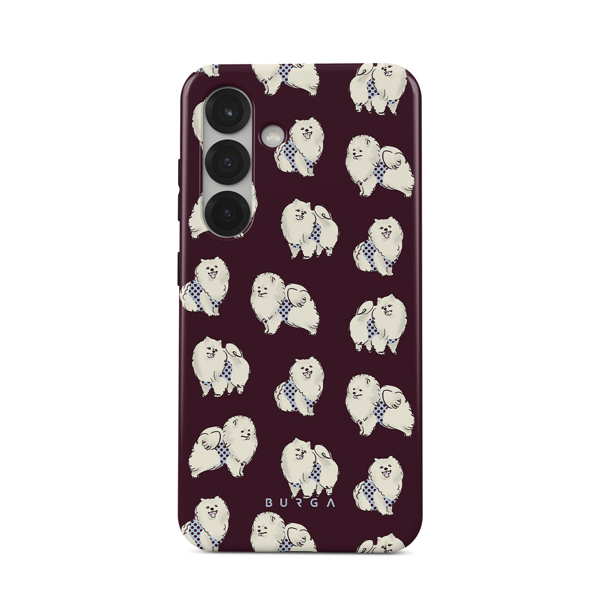 Główne elementy projektu: białe, puszyste psy na ciemnym bordowym tle, pudle, zwierzęta domowe.