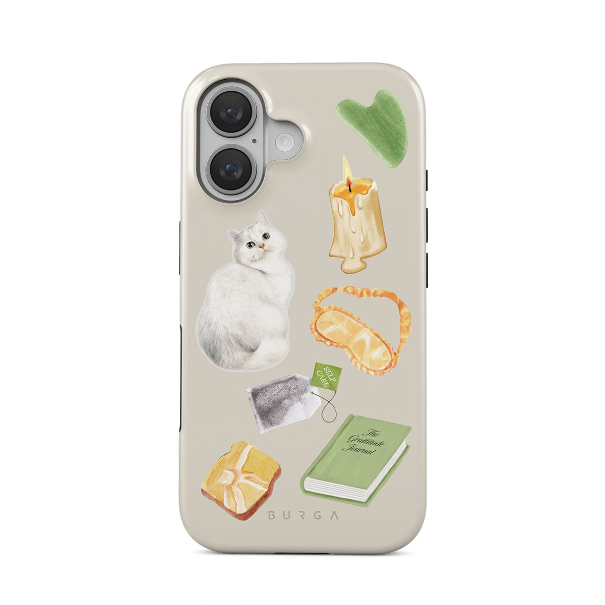 Główne elementy projektu: białego kota, zieloną książkę, świecę, kamień Gua Sha, opaskę na oczy, torebkę herbaty, żółty kryształ.