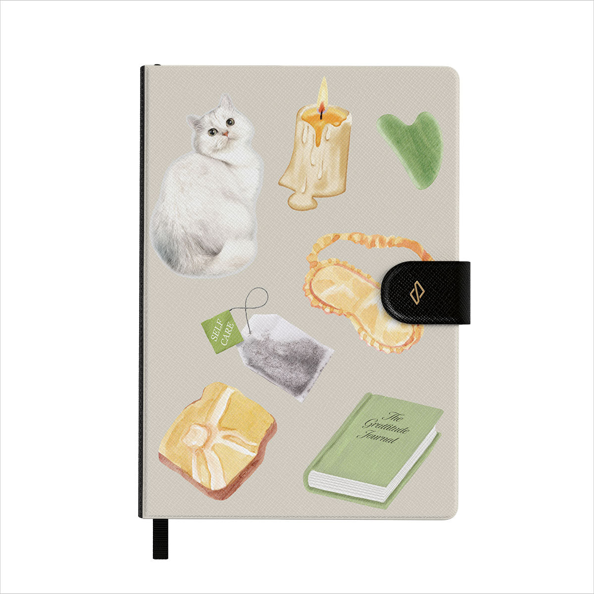 Główne elementy projektu: białego kota, zieloną książkę, świecę, kamień Gua Sha, opaskę na oczy, torebkę herbaty, żółty kryształ.