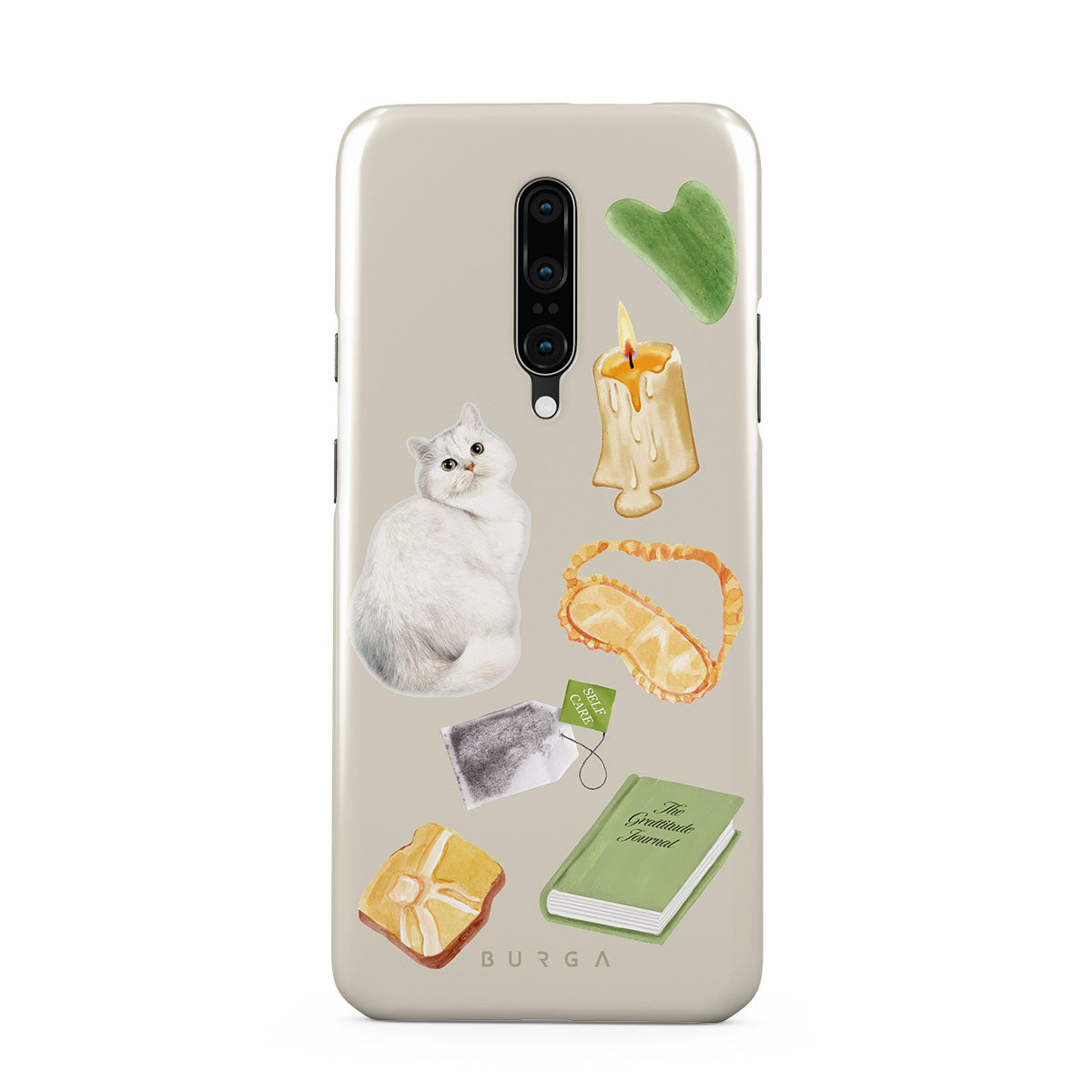 Główne elementy projektu: białego kota, zieloną książkę, świecę, kamień Gua Sha, opaskę na oczy, torebkę herbaty, żółty kryształ.