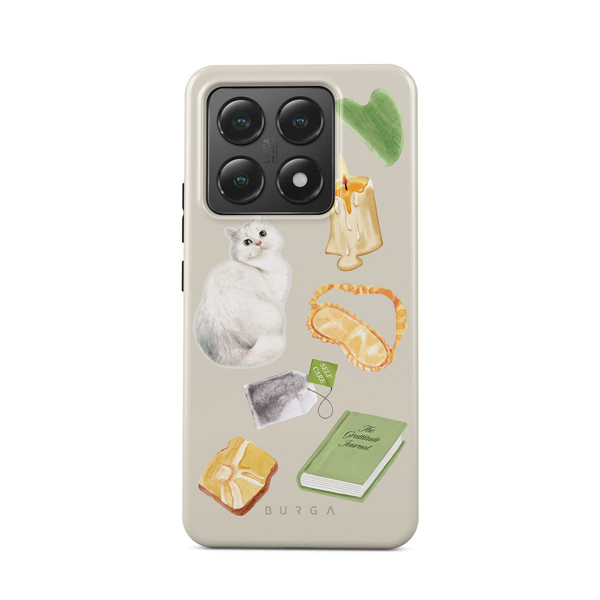Główne elementy projektu: białego kota, zieloną książkę, świecę, kamień Gua Sha, opaskę na oczy, torebkę herbaty, żółty kryształ.