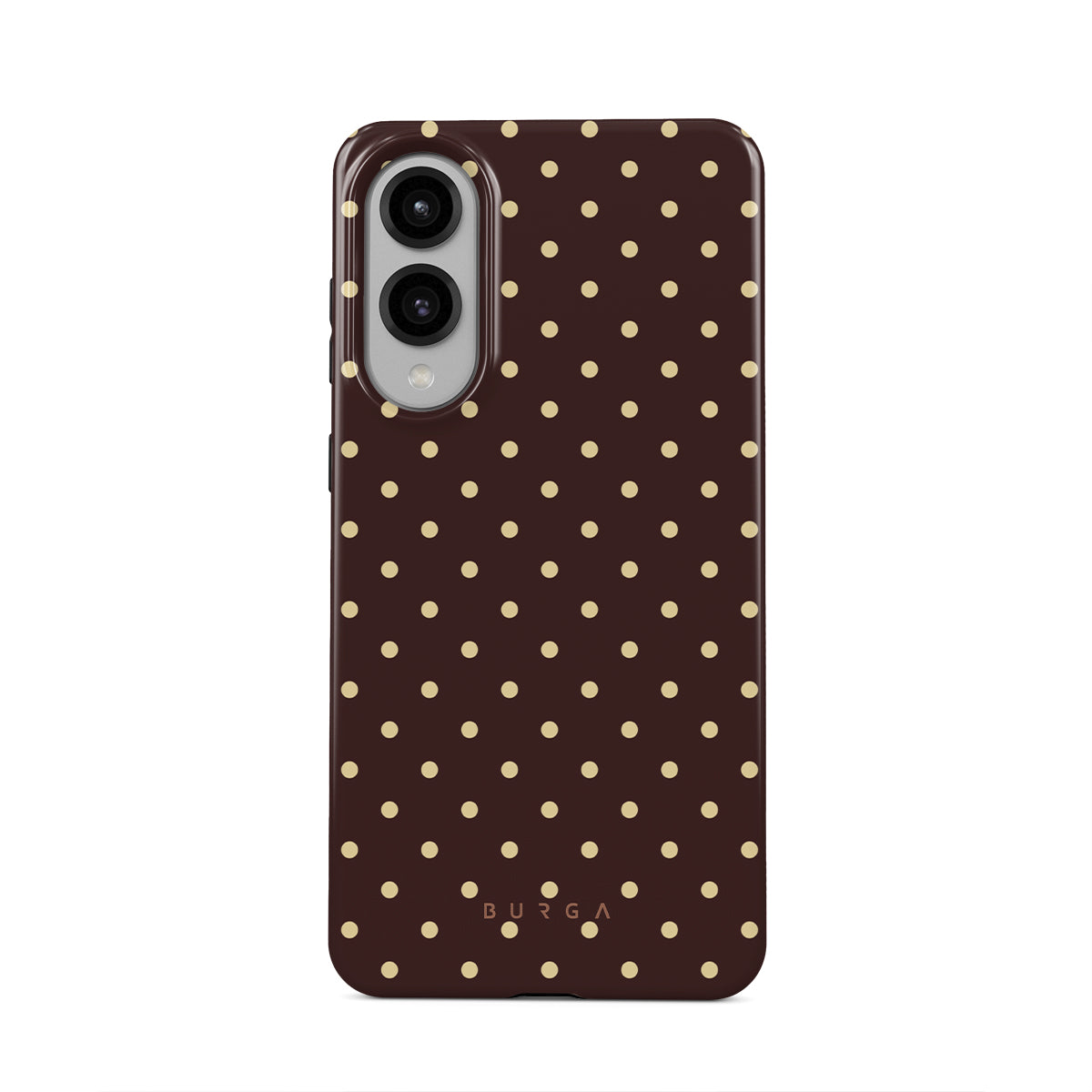 Główne elementy projektu: brązowe tło, beżowe grochy
