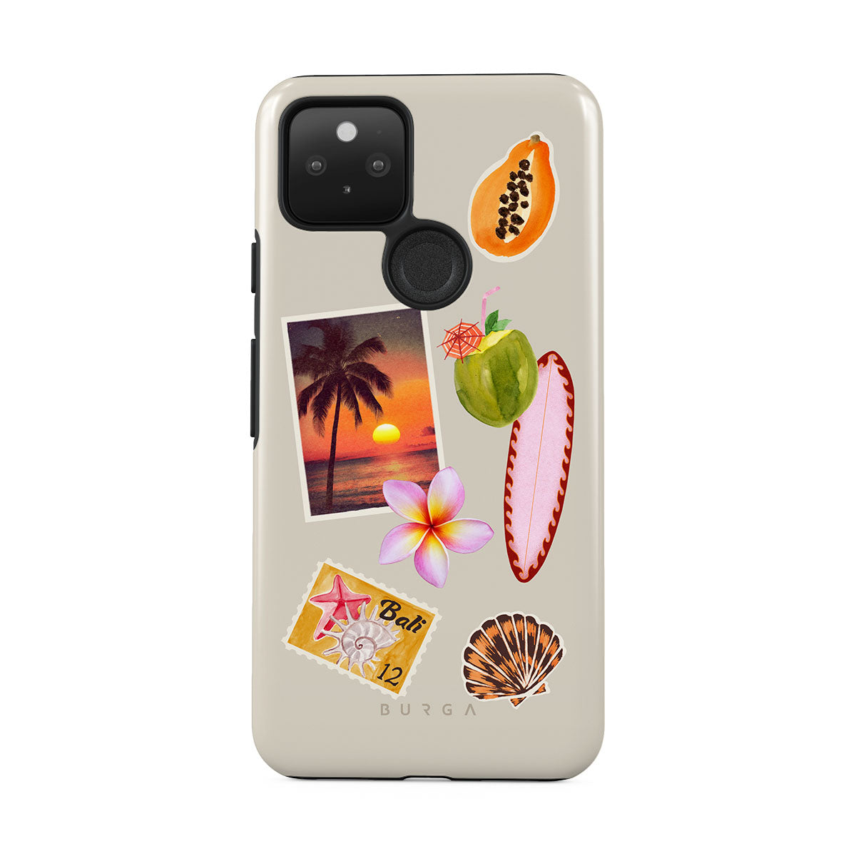 Główne elementy projektu: zdjęcie tropikalnego zachodu słońca, papaję, zielony kokos, różową deskę surfingową, różowy kwiat plumerii, pomarańczową muszlę, pocztówkę z Bali.