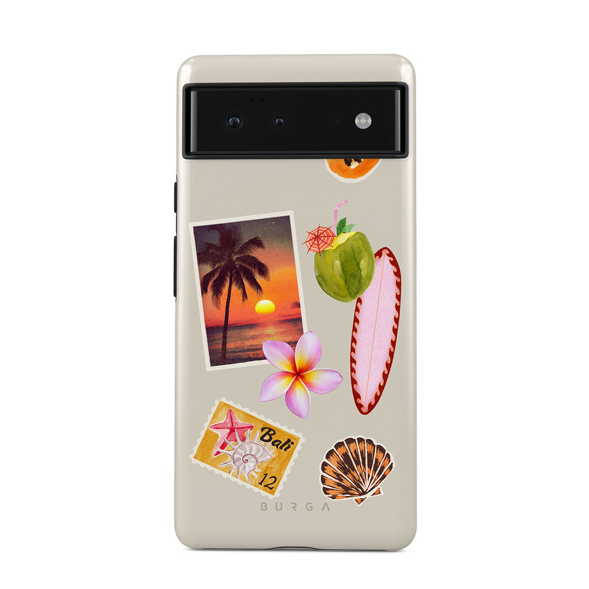 Główne elementy projektu: zdjęcie tropikalnego zachodu słońca, papaję, zielony kokos, różową deskę surfingową, różowy kwiat plumerii, pomarańczową muszlę, pocztówkę z Bali.