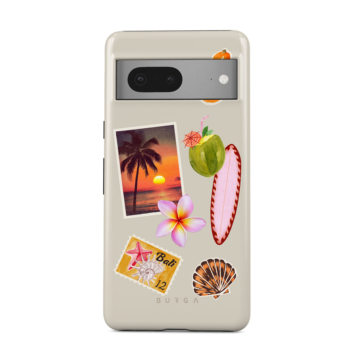 Główne elementy projektu: zdjęcie tropikalnego zachodu słońca, papaję, zielony kokos, różową deskę surfingową, różowy kwiat plumerii, pomarańczową muszlę, pocztówkę z Bali.