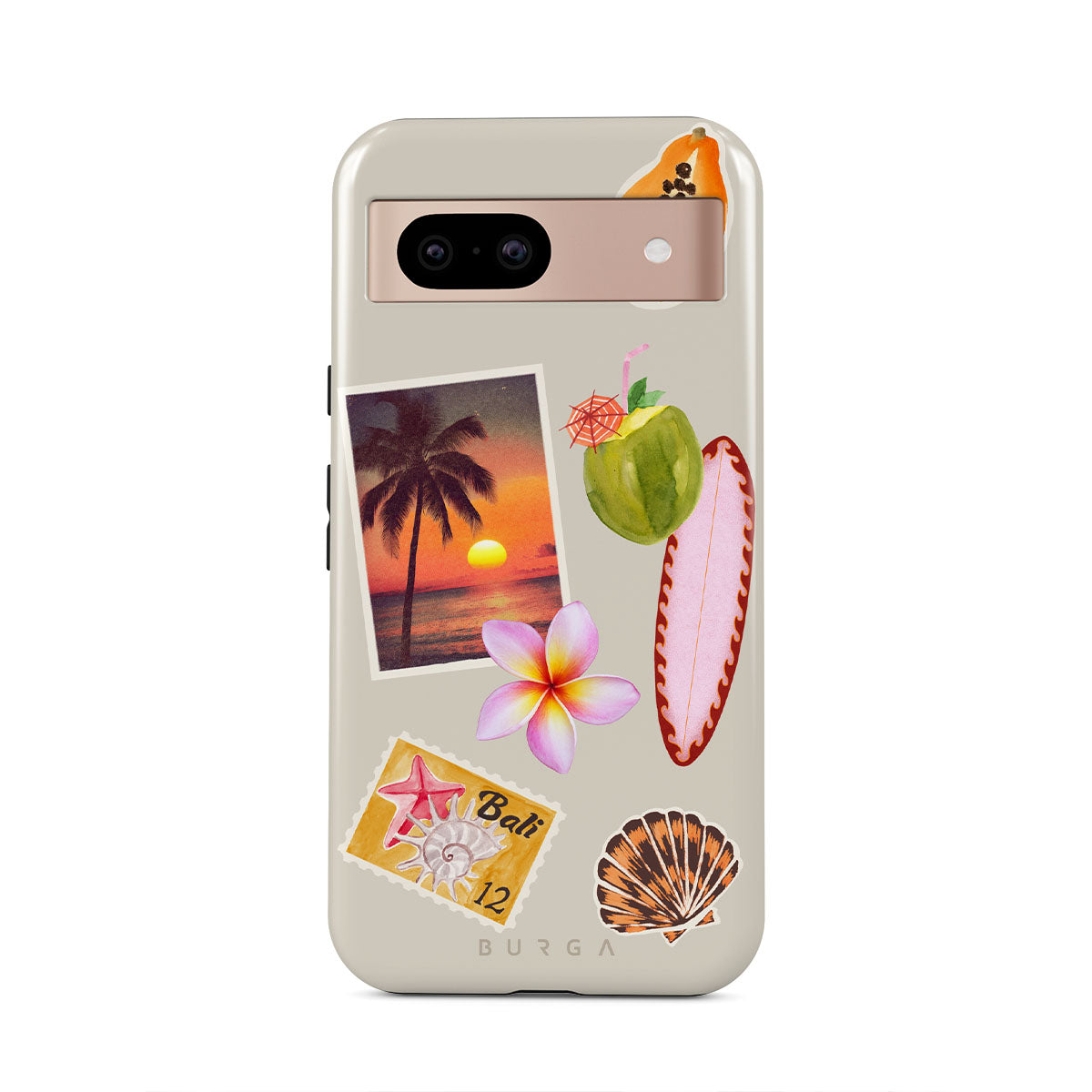 Główne elementy projektu: zdjęcie tropikalnego zachodu słońca, papaję, zielony kokos, różową deskę surfingową, różowy kwiat plumerii, pomarańczową muszlę, pocztówkę z Bali.