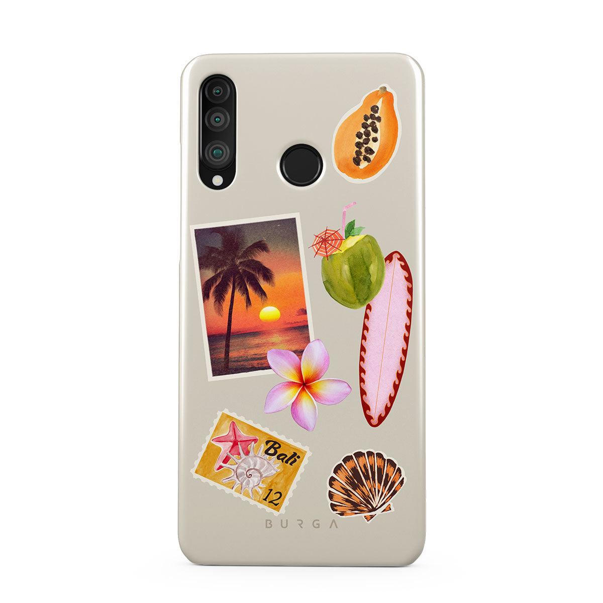 Główne elementy projektu: zdjęcie tropikalnego zachodu słońca, papaję, zielony kokos, różową deskę surfingową, różowy kwiat plumerii, pomarańczową muszlę, pocztówkę z Bali.