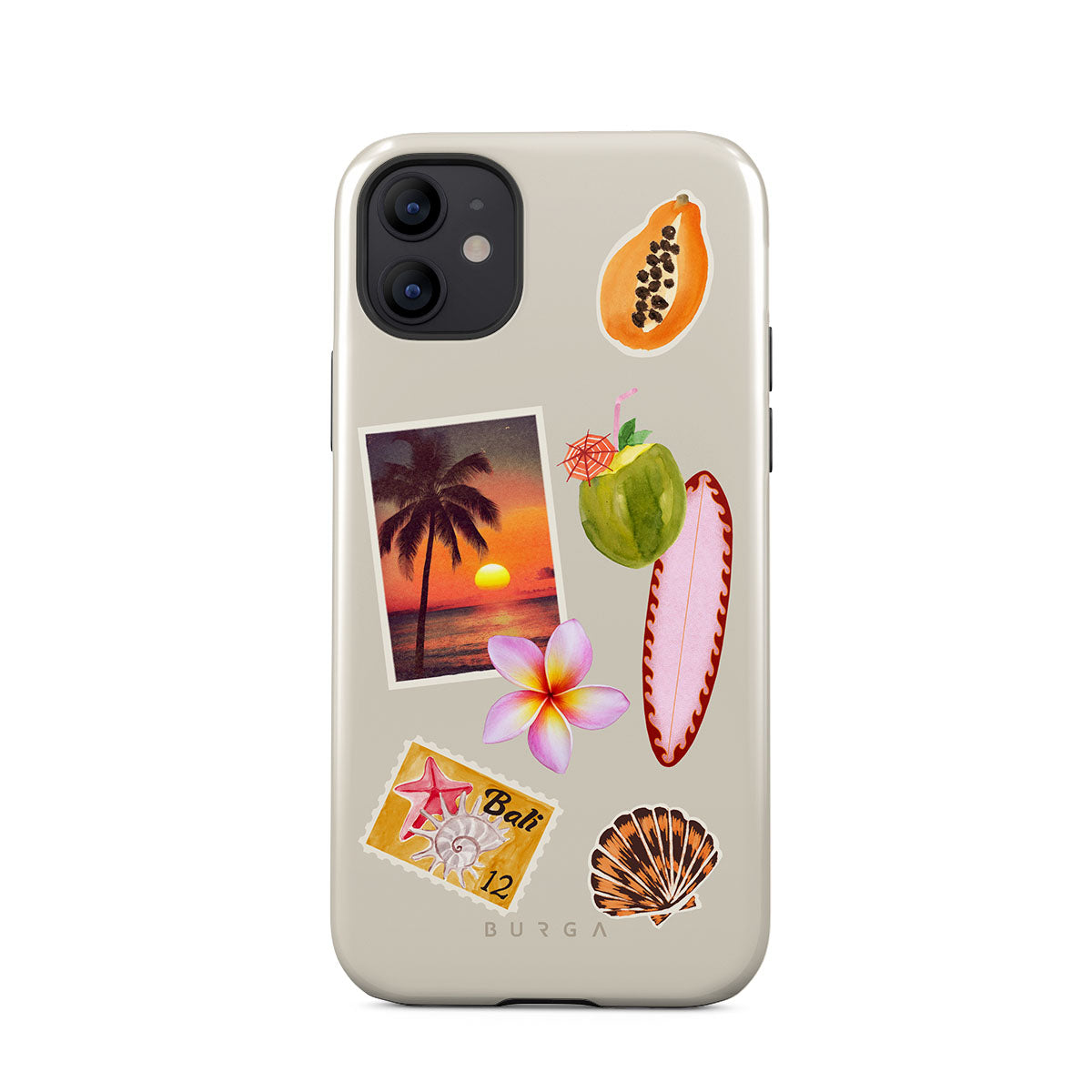 Główne elementy projektu: zdjęcie tropikalnego zachodu słońca, papaję, zielony kokos, różową deskę surfingową, różowy kwiat plumerii, pomarańczową muszlę, pocztówkę z Bali.