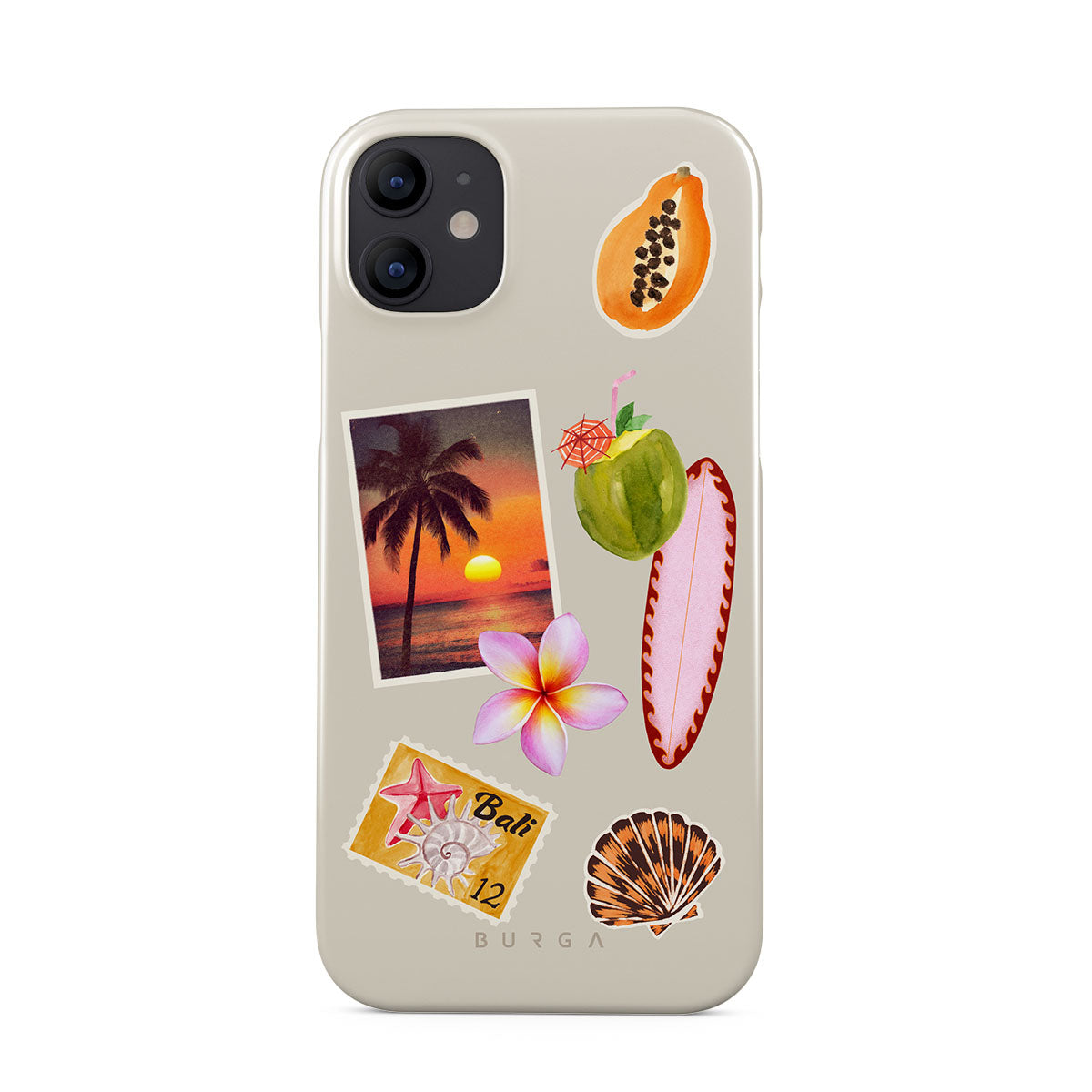Główne elementy projektu: zdjęcie tropikalnego zachodu słońca, papaję, zielony kokos, różową deskę surfingową, różowy kwiat plumerii, pomarańczową muszlę, pocztówkę z Bali.