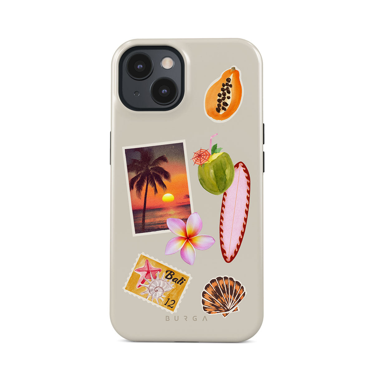 Główne elementy projektu: zdjęcie tropikalnego zachodu słońca, papaję, zielony kokos, różową deskę surfingową, różowy kwiat plumerii, pomarańczową muszlę, pocztówkę z Bali.