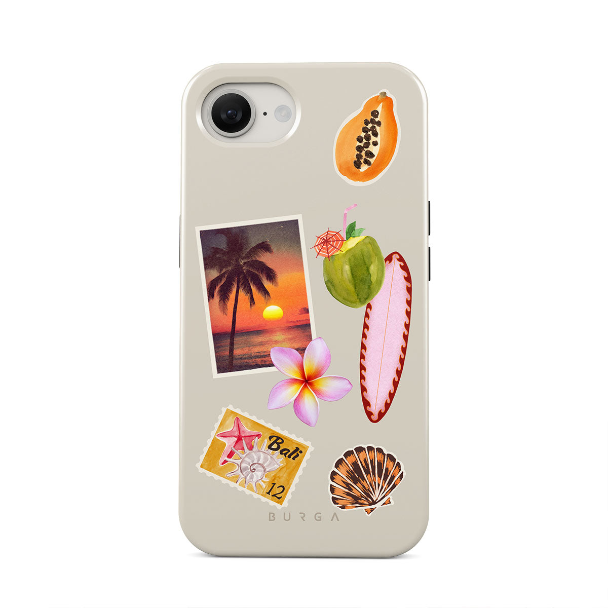 Główne elementy projektu: zdjęcie tropikalnego zachodu słońca, papaję, zielony kokos, różową deskę surfingową, różowy kwiat plumerii, pomarańczową muszlę, pocztówkę z Bali.