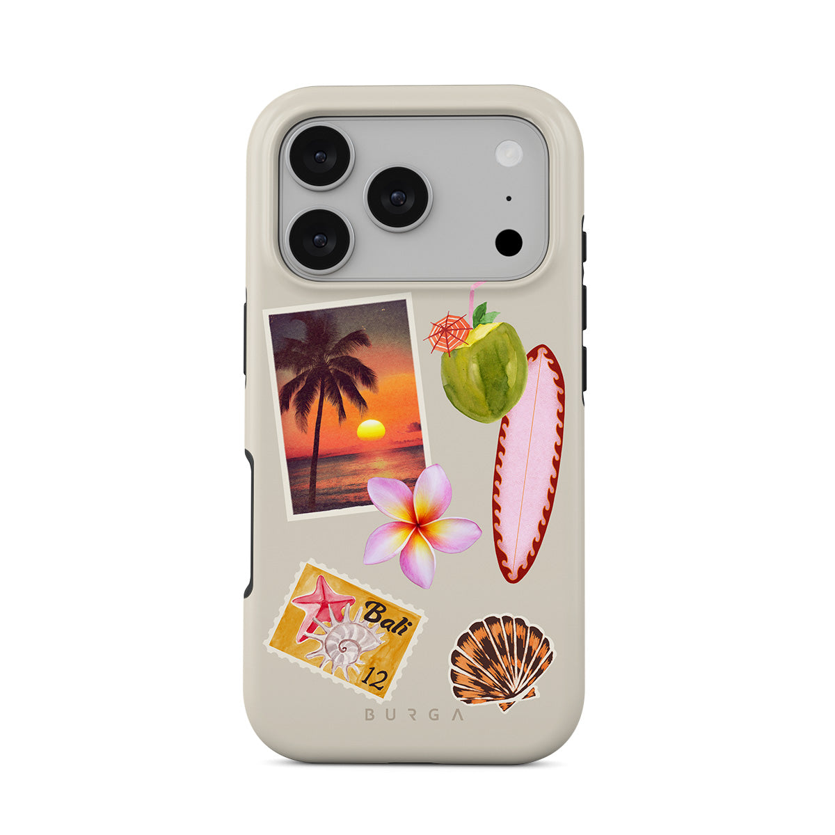 Główne elementy projektu: zdjęcie tropikalnego zachodu słońca, papaję, zielony kokos, różową deskę surfingową, różowy kwiat plumerii, pomarańczową muszlę, pocztówkę z Bali.