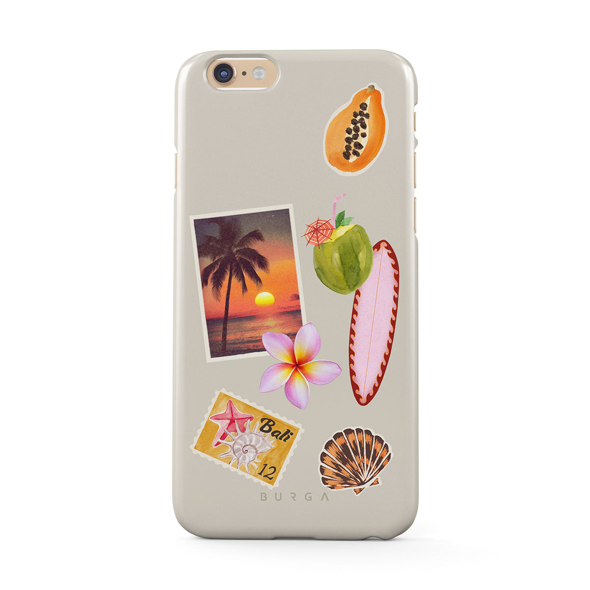 Główne elementy projektu: zdjęcie tropikalnego zachodu słońca, papaję, zielony kokos, różową deskę surfingową, różowy kwiat plumerii, pomarańczową muszlę, pocztówkę z Bali.