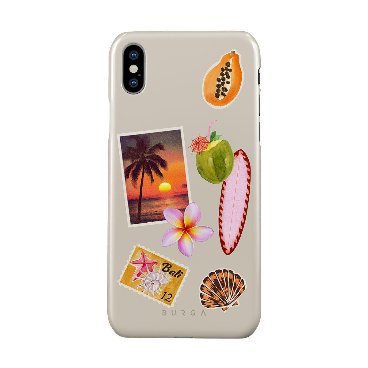Główne elementy projektu: zdjęcie tropikalnego zachodu słońca, papaję, zielony kokos, różową deskę surfingową, różowy kwiat plumerii, pomarańczową muszlę, pocztówkę z Bali.