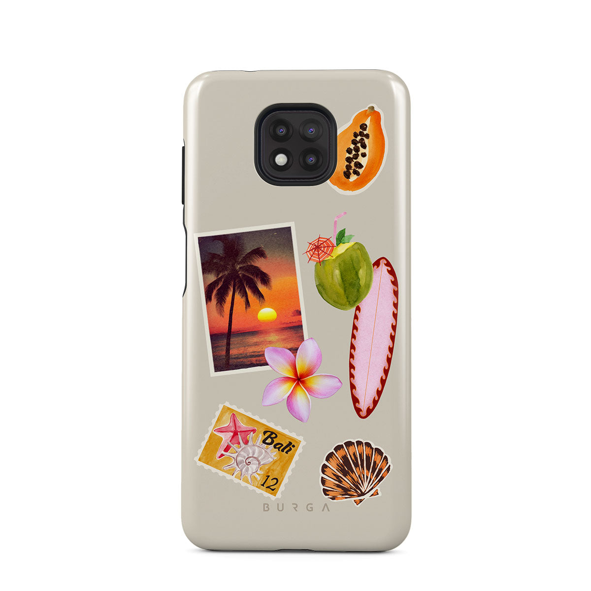 Główne elementy projektu: zdjęcie tropikalnego zachodu słońca, papaję, zielony kokos, różową deskę surfingową, różowy kwiat plumerii, pomarańczową muszlę, pocztówkę z Bali.