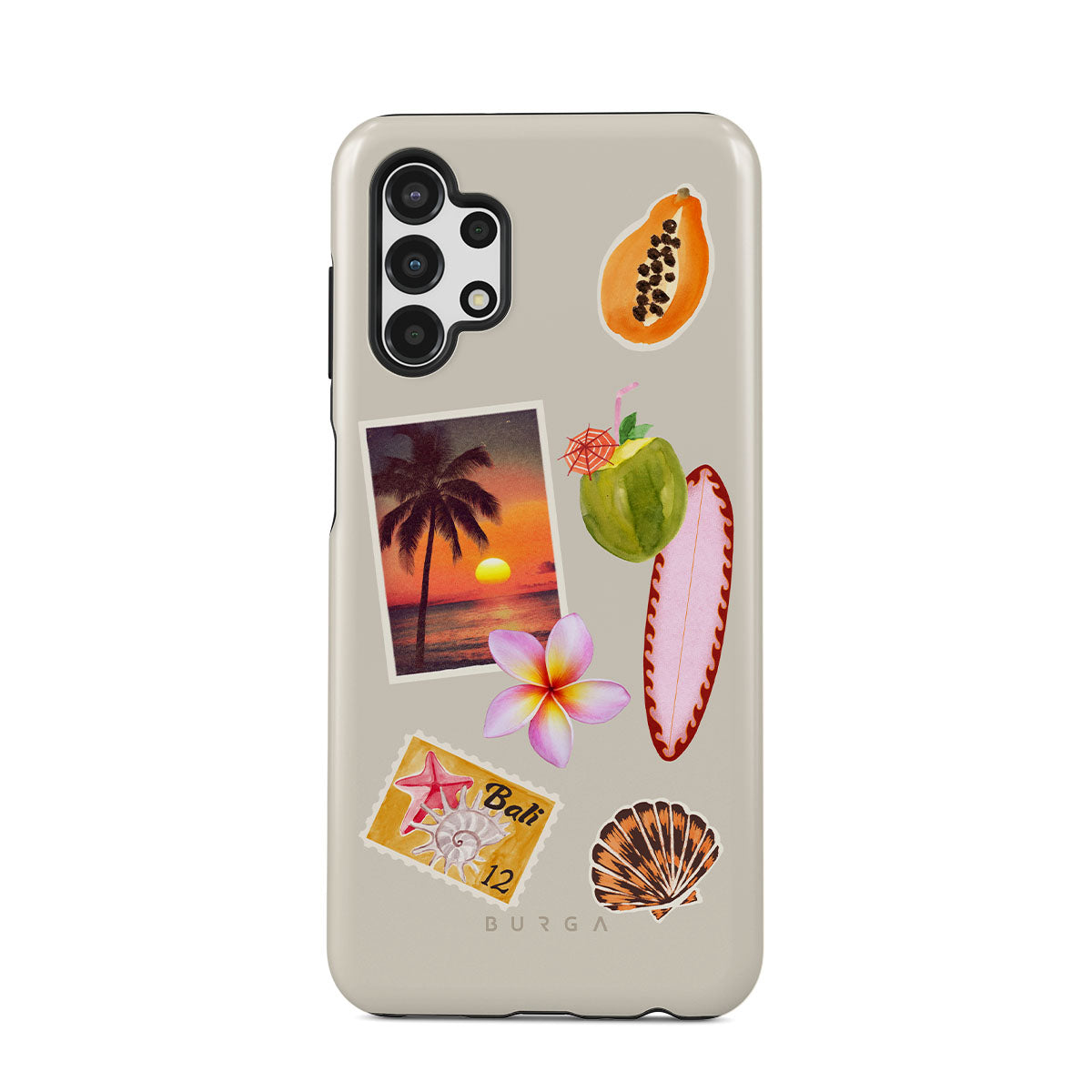 Główne elementy projektu: zdjęcie tropikalnego zachodu słońca, papaję, zielony kokos, różową deskę surfingową, różowy kwiat plumerii, pomarańczową muszlę, pocztówkę z Bali.