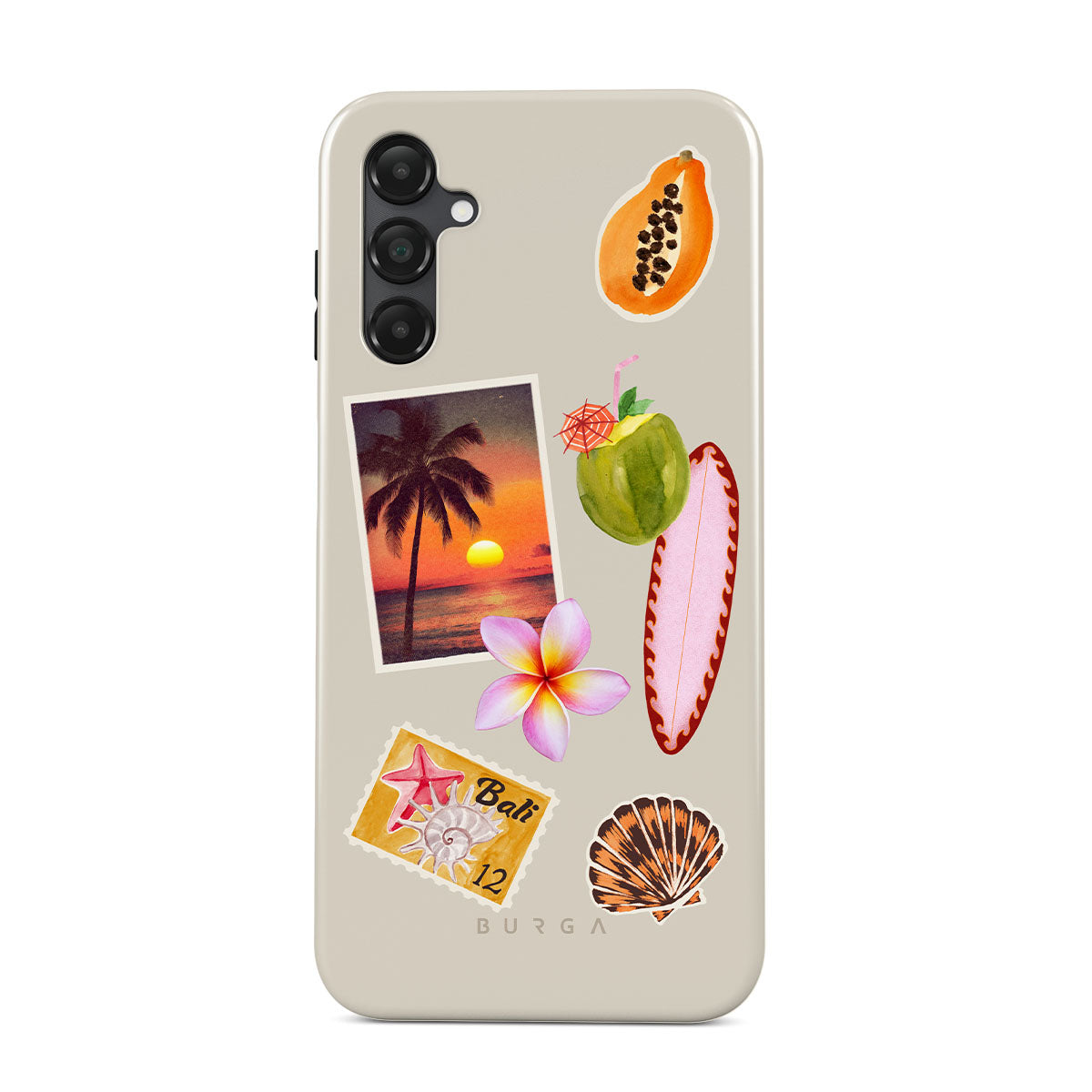 Główne elementy projektu: zdjęcie tropikalnego zachodu słońca, papaję, zielony kokos, różową deskę surfingową, różowy kwiat plumerii, pomarańczową muszlę, pocztówkę z Bali.