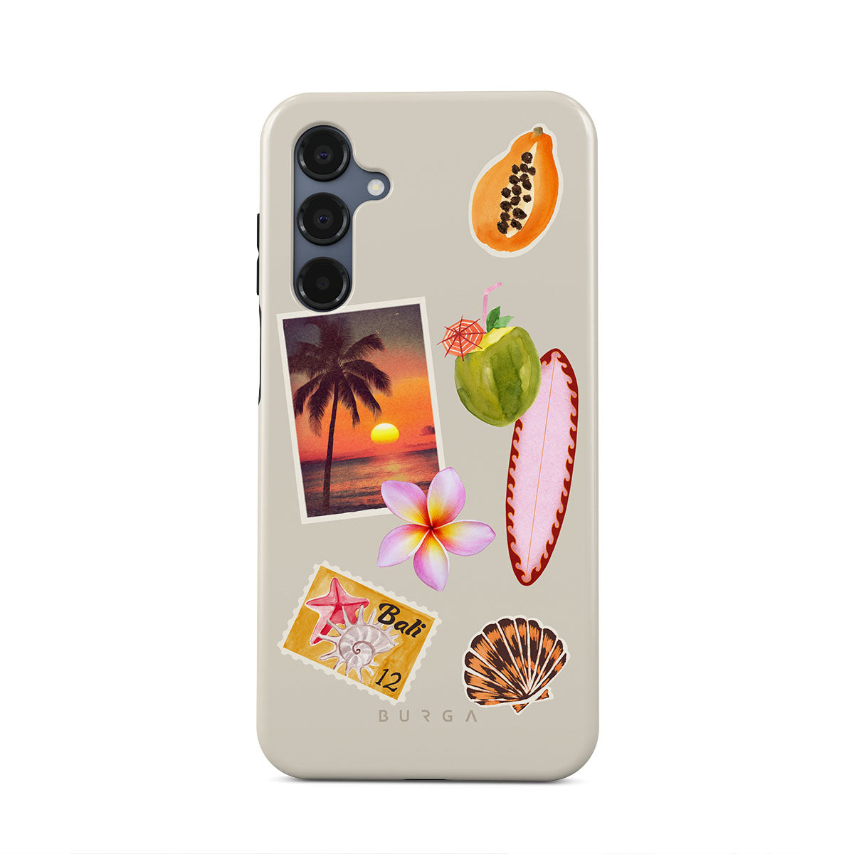 Główne elementy projektu: zdjęcie tropikalnego zachodu słońca, papaję, zielony kokos, różową deskę surfingową, różowy kwiat plumerii, pomarańczową muszlę, pocztówkę z Bali.