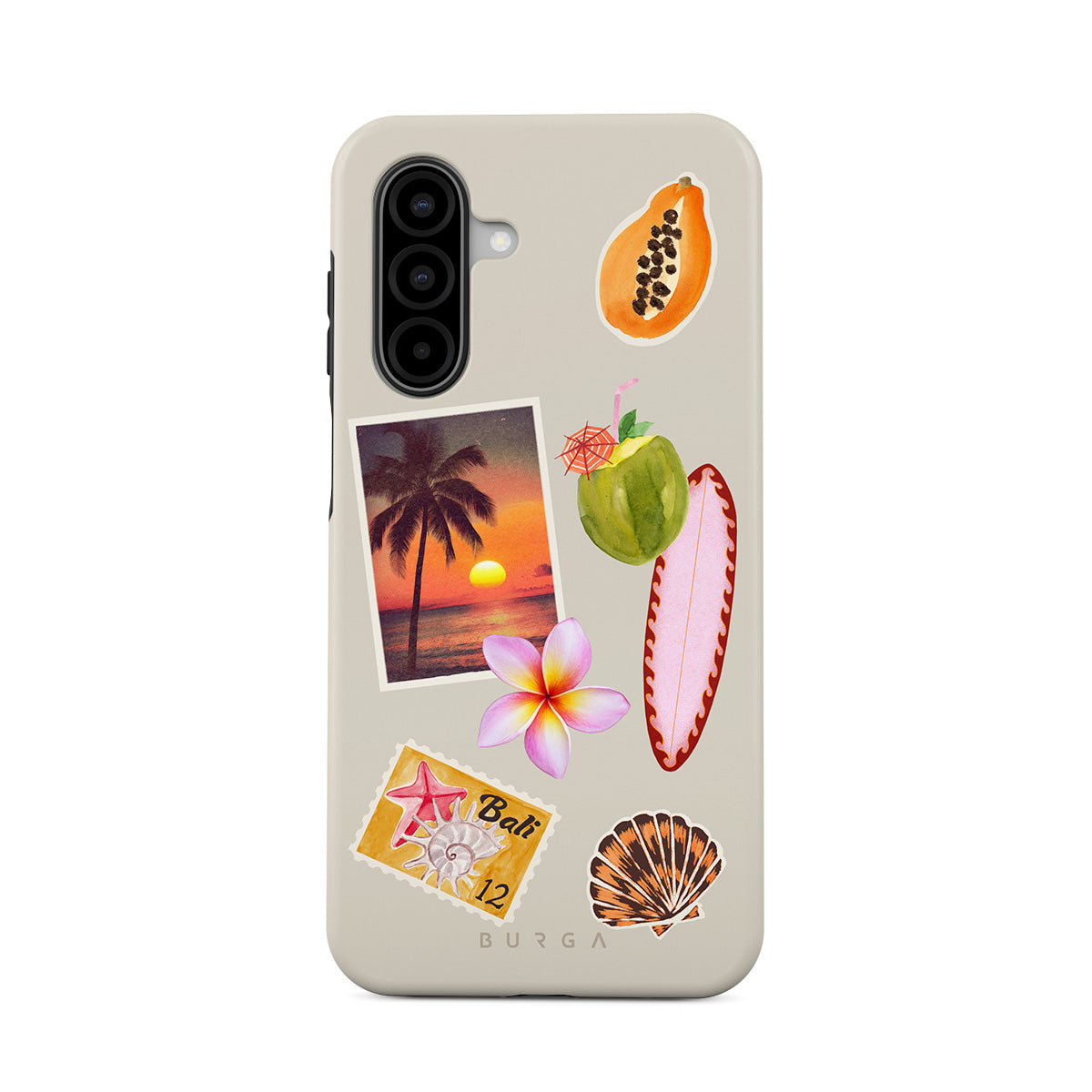 Główne elementy projektu: zdjęcie tropikalnego zachodu słońca, papaję, zielony kokos, różową deskę surfingową, różowy kwiat plumerii, pomarańczową muszlę, pocztówkę z Bali.