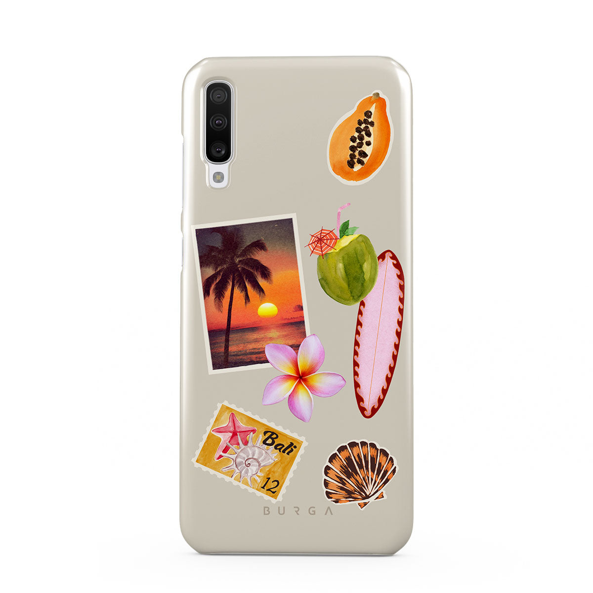 Główne elementy projektu: zdjęcie tropikalnego zachodu słońca, papaję, zielony kokos, różową deskę surfingową, różowy kwiat plumerii, pomarańczową muszlę, pocztówkę z Bali.