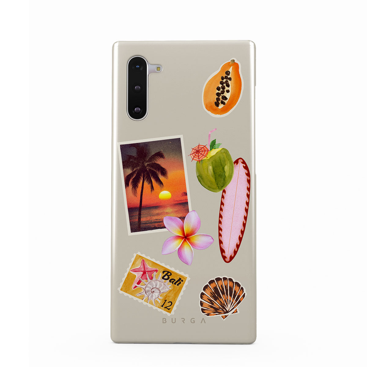 Główne elementy projektu: zdjęcie tropikalnego zachodu słońca, papaję, zielony kokos, różową deskę surfingową, różowy kwiat plumerii, pomarańczową muszlę, pocztówkę z Bali.