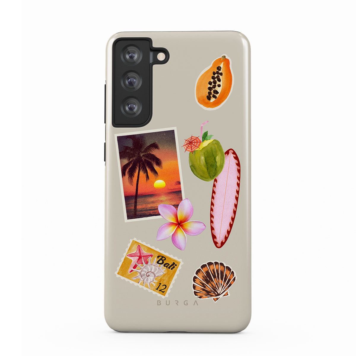 Główne elementy projektu: zdjęcie tropikalnego zachodu słońca, papaję, zielony kokos, różową deskę surfingową, różowy kwiat plumerii, pomarańczową muszlę, pocztówkę z Bali.