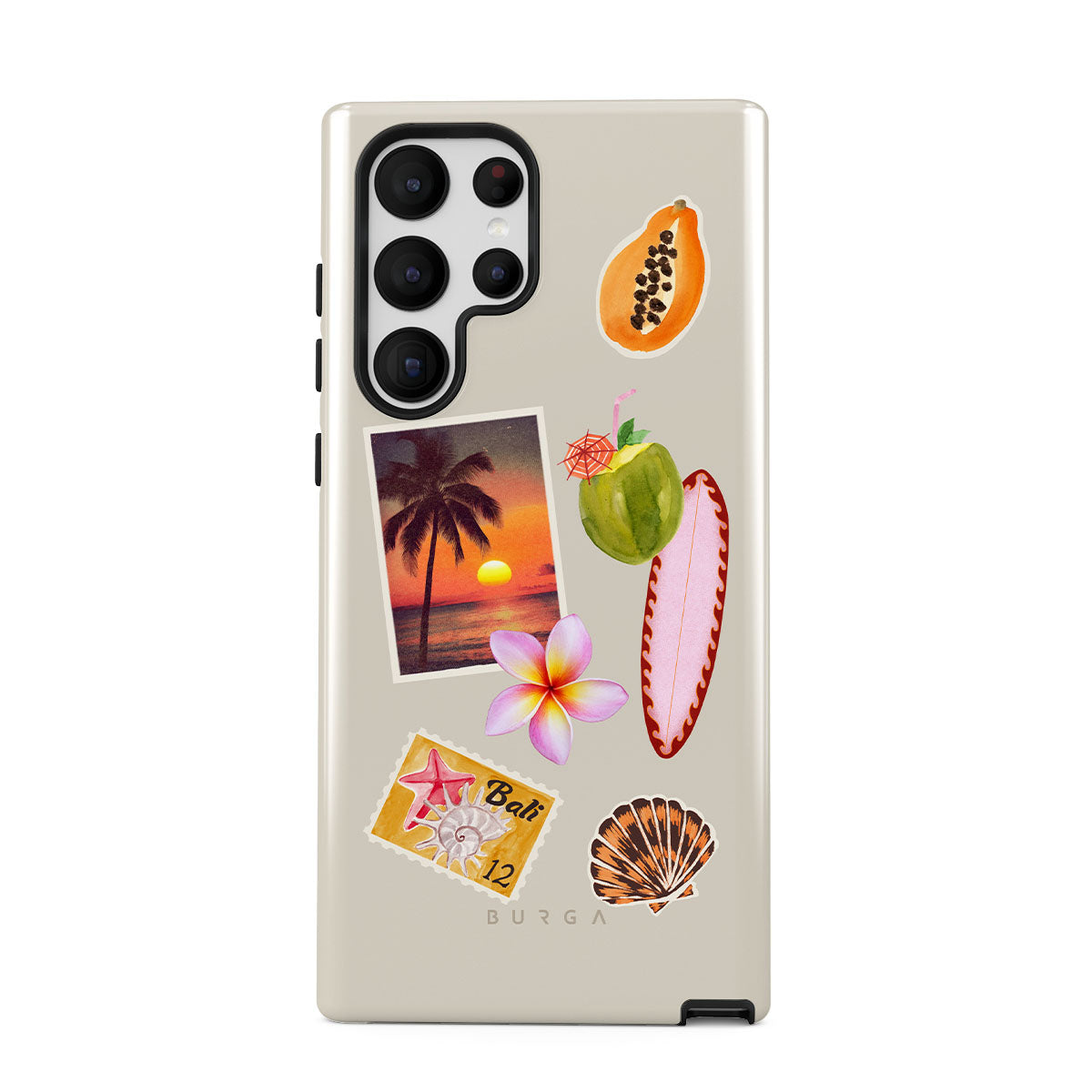 Główne elementy projektu: zdjęcie tropikalnego zachodu słońca, papaję, zielony kokos, różową deskę surfingową, różowy kwiat plumerii, pomarańczową muszlę, pocztówkę z Bali.