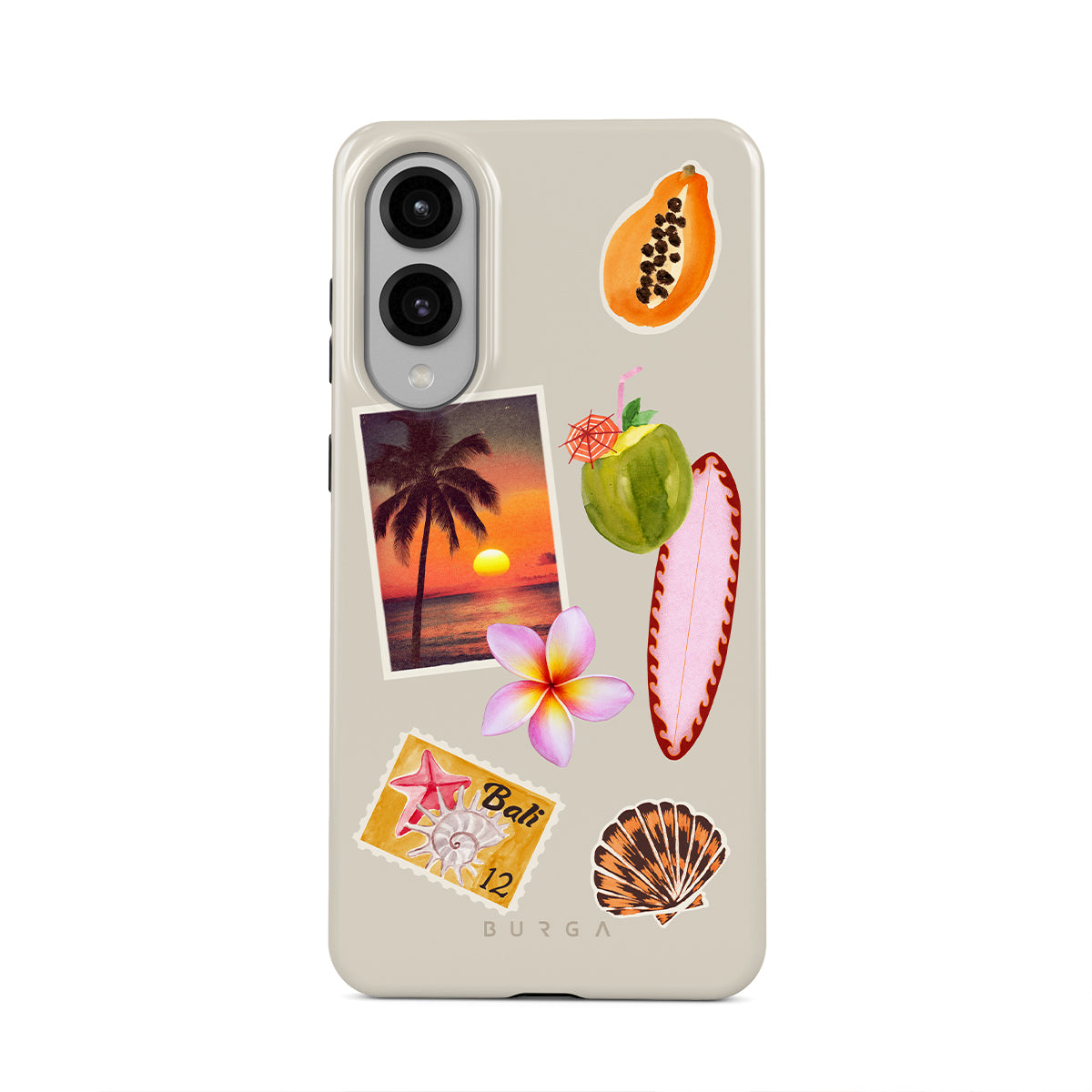 Główne elementy projektu: zdjęcie tropikalnego zachodu słońca, papaję, zielony kokos, różową deskę surfingową, różowy kwiat plumerii, pomarańczową muszlę, pocztówkę z Bali.