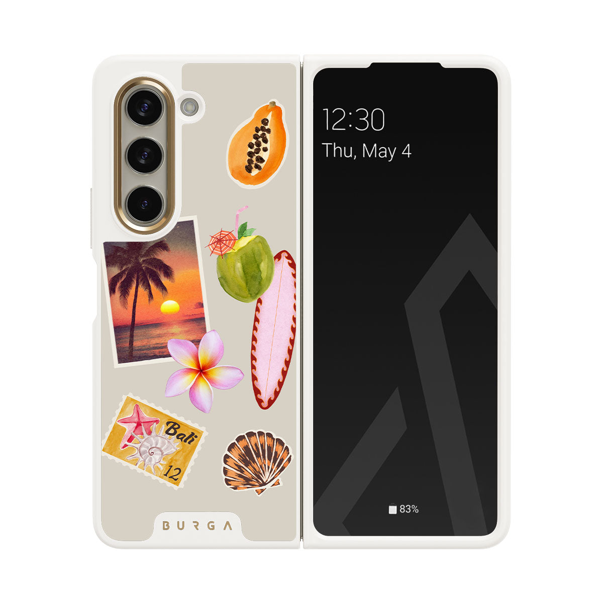 Główne elementy projektu: zdjęcie tropikalnego zachodu słońca, papaję, zielony kokos, różową deskę surfingową, różowy kwiat plumerii, pomarańczową muszlę, pocztówkę z Bali.