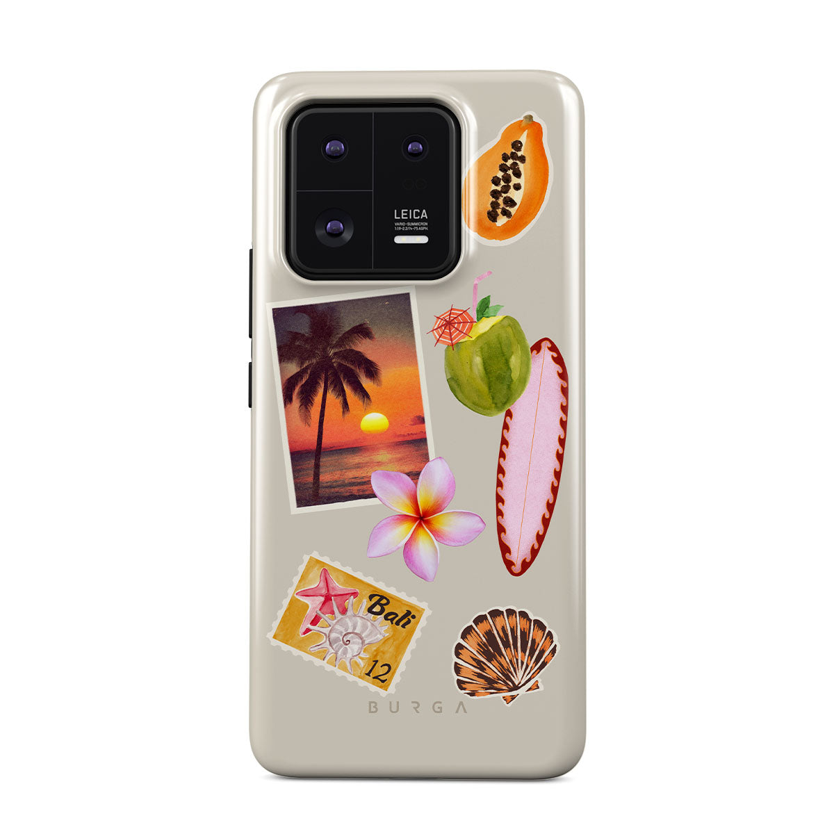 Główne elementy projektu: zdjęcie tropikalnego zachodu słońca, papaję, zielony kokos, różową deskę surfingową, różowy kwiat plumerii, pomarańczową muszlę, pocztówkę z Bali.