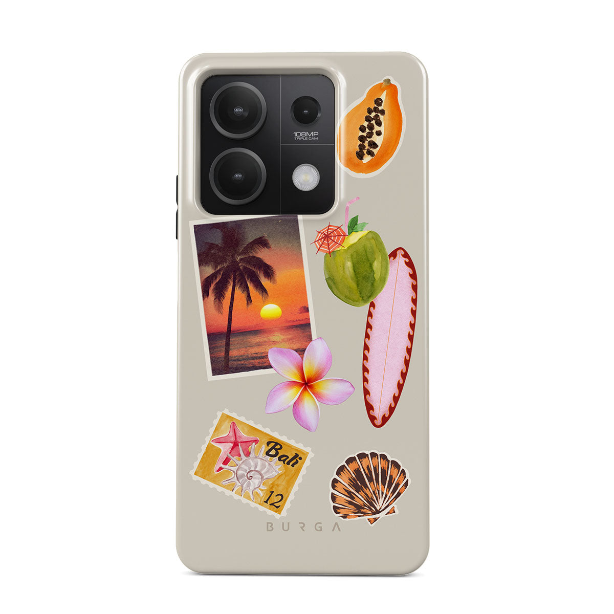 Główne elementy projektu: zdjęcie tropikalnego zachodu słońca, papaję, zielony kokos, różową deskę surfingową, różowy kwiat plumerii, pomarańczową muszlę, pocztówkę z Bali.