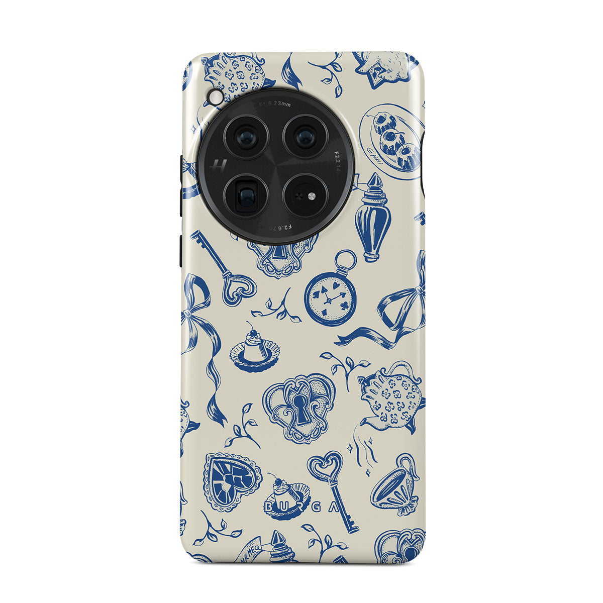 Główne elementy projektu: filiżanki, imbryki, zegarki kieszonkowe, klucz, serca, ceramikę, biało-niebieski wzór