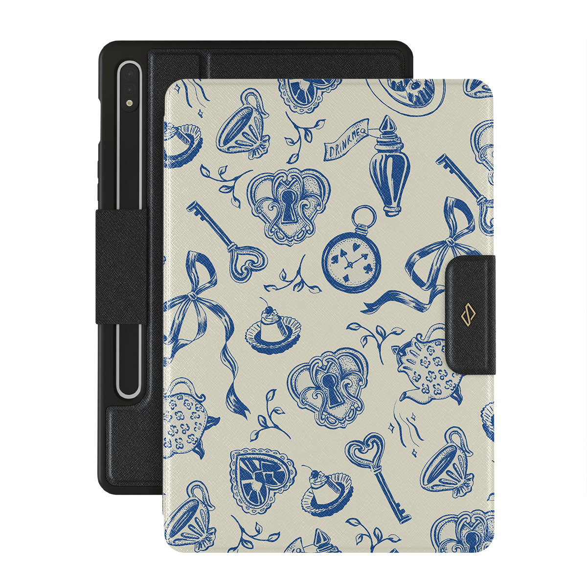 Główne elementy projektu: filiżanki, imbryki, zegarki kieszonkowe, klucz, serca, ceramikę, biało-niebieski wzór