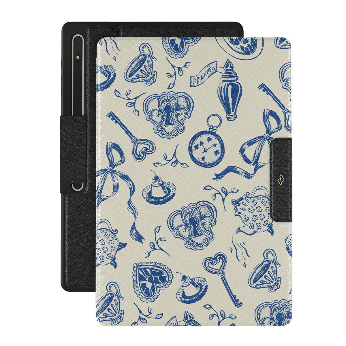 Główne elementy projektu: filiżanki, imbryki, zegarki kieszonkowe, klucz, serca, ceramikę, biało-niebieski wzór