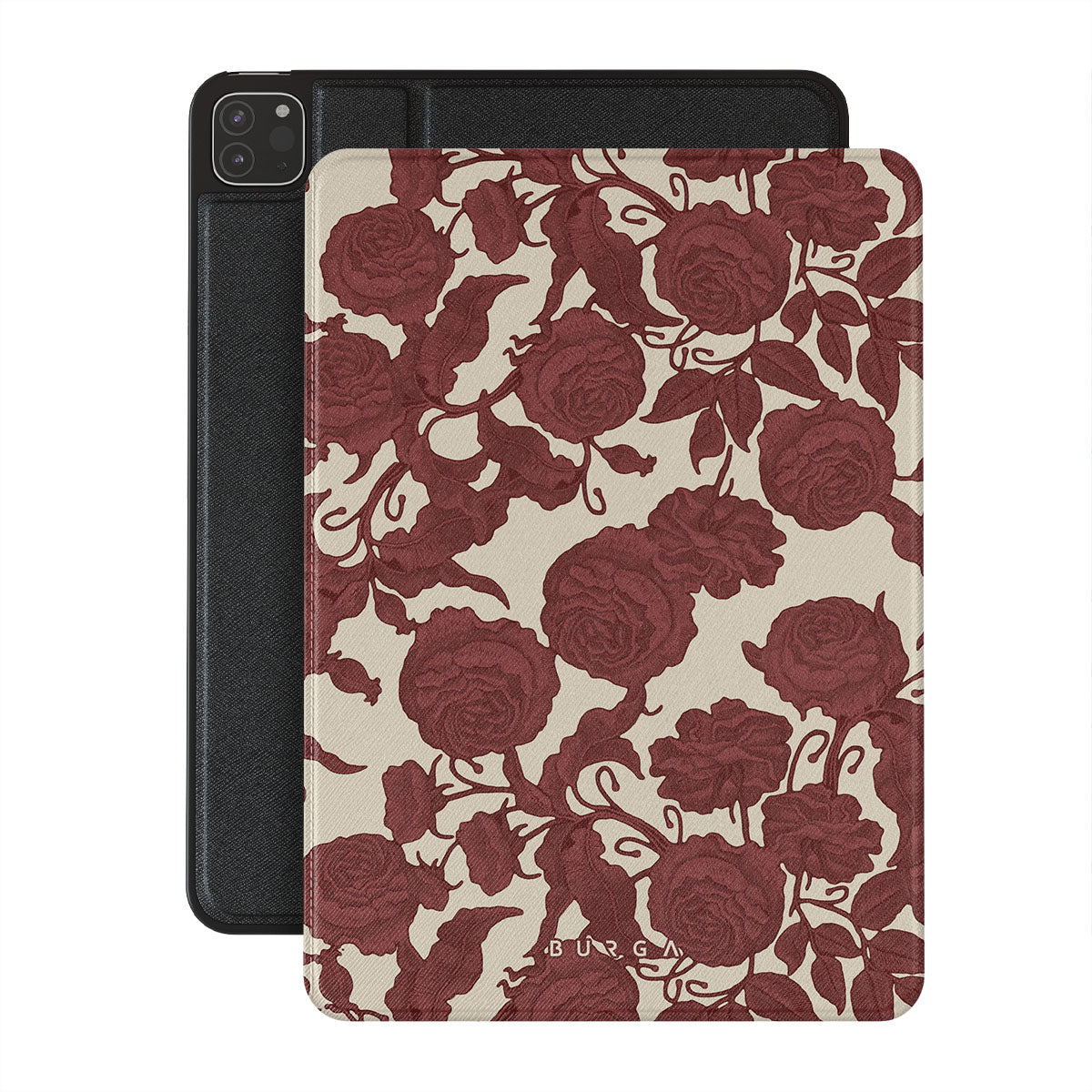 Główne elementy projektu: ciemnoczerwone róże, misterny wzór kwiatowy, wzór vintage.
