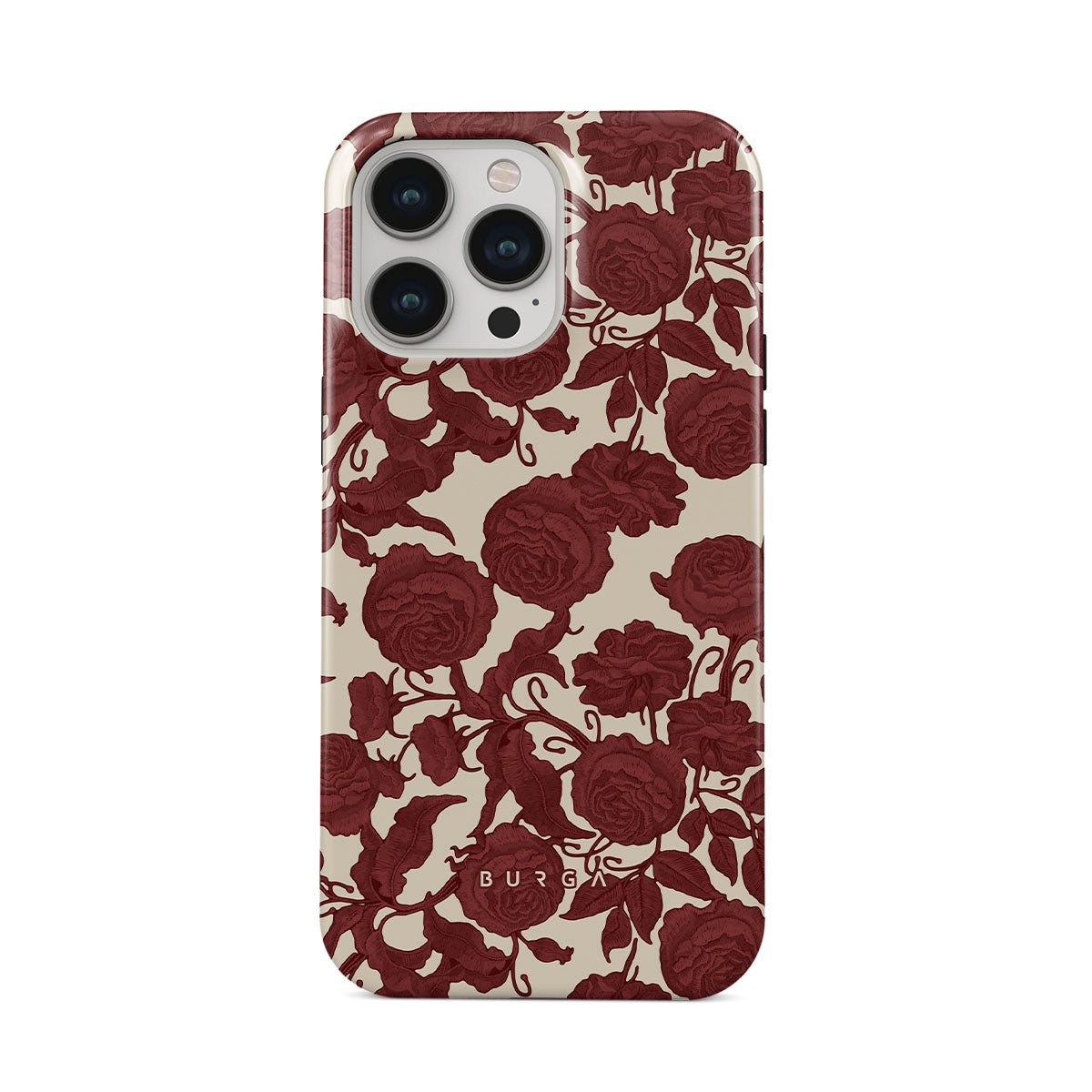 Główne elementy projektu: ciemnoczerwone róże, misterny wzór kwiatowy, wzór vintage.